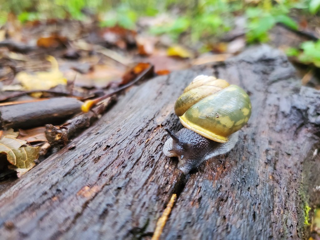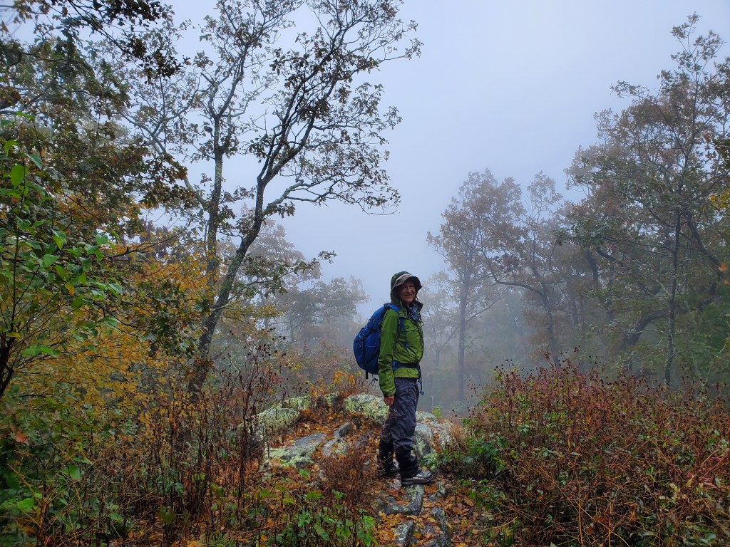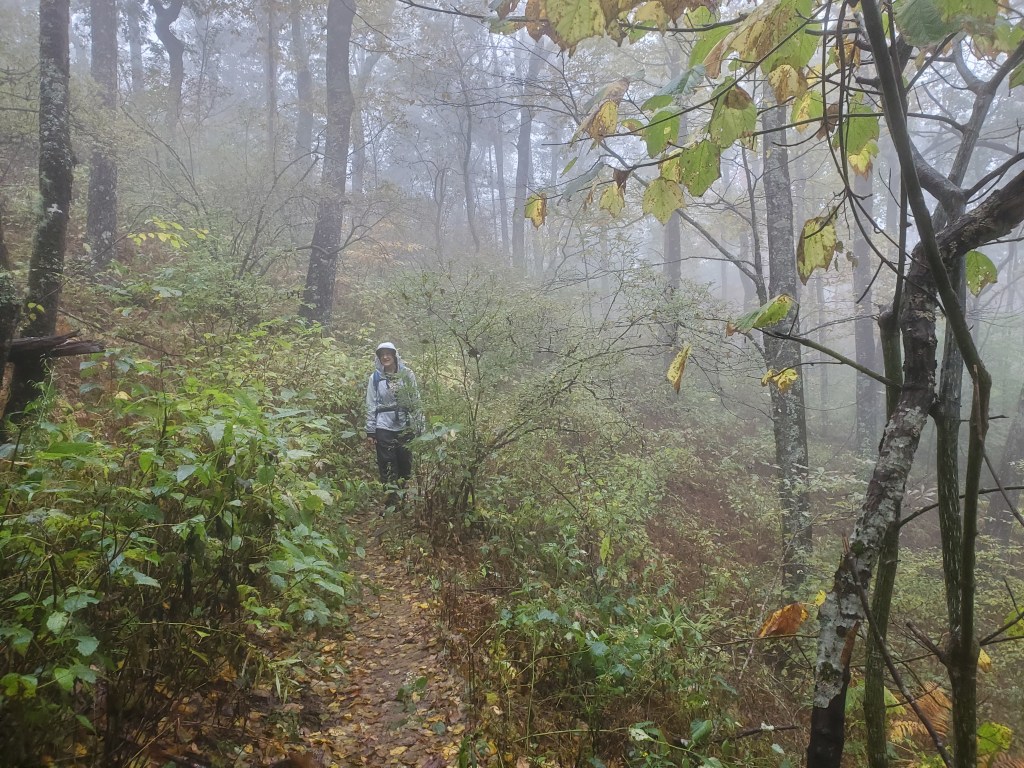 After returning to the car, we headed across the road to get back on Duncan Ridge Trail (DRT). Map here. The weather had started to get a bit worse, but we had rain gear. The trail climbed steeply from the gap, but the trail was in good shape. After about a mile, we needed to head off trail to get to the summit of Slaughter Mountain. This bushwhack was pretty tough with thick briers and wet vegetation. I use the GaiaGPS app on my phone for navigation, and it was a good thing to have it because it’s easier to get off course when the going is rough. I’m not sure why, but we kept drifting to the right of our intended course. The descent from the summit to DRT was steep and tricky with thick vegetation and boulders to navigate. Once we made it back to the trail, it was easy enough to continue on DRT to the Appalachian Trail (AT). Once we hit the AT, it was only a half mile to the summit of Blood Mountain. This part of our day was about a six mile round trip. Not a lot of photos on this part. Here’s Anne in the mist and a cool snail.