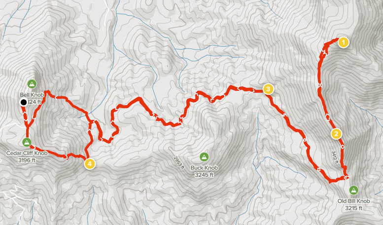 We scouted Bell Knob a few months ago to help us plan an Eagle Mountain ascent. I have a post that talks about that trip. We decided to follow a route from Cedar Cliff Knob to Bell Gap (#4 on the map). That descent was incredibly difficult, and so steep in places that I just slid down on my buttocks like I was on snow. The goal was a quick descent to a four-wheeler trail running through Bell Gap, but it took way more time and effort than planned.