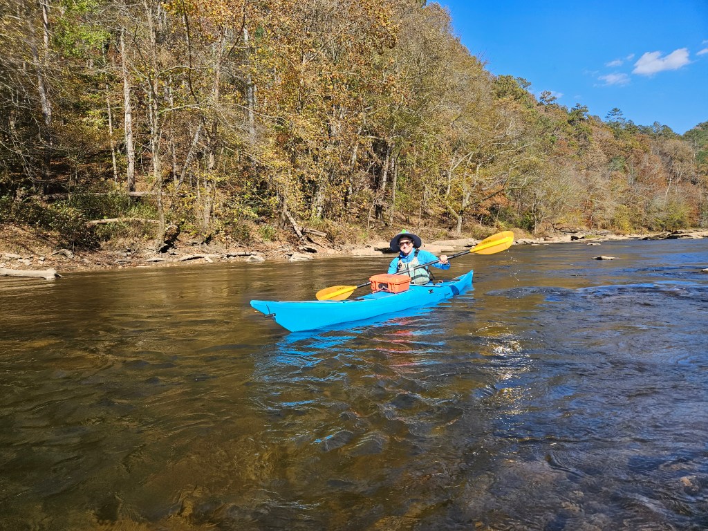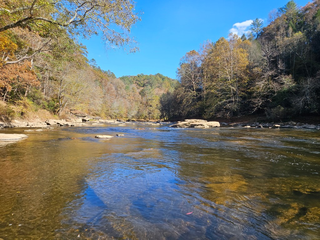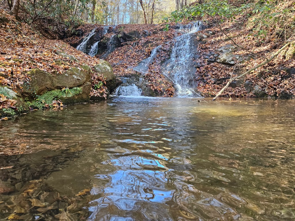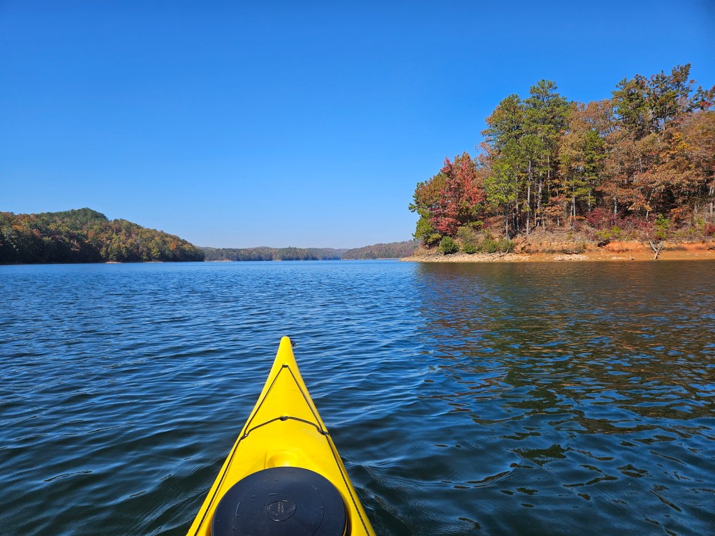 We weren’t quite sure what to expect as we hadn’t done this trip before; our goal was to paddle to where the Coosawattee flows into the lake. The scenery was absolutely beautiful with the hills displaying fall colors. There were quite a few small beaches on the lake shore. We found a small waterfall that was one of the highlights of the day. It’s located on “river right” just before we got to the flowing water.