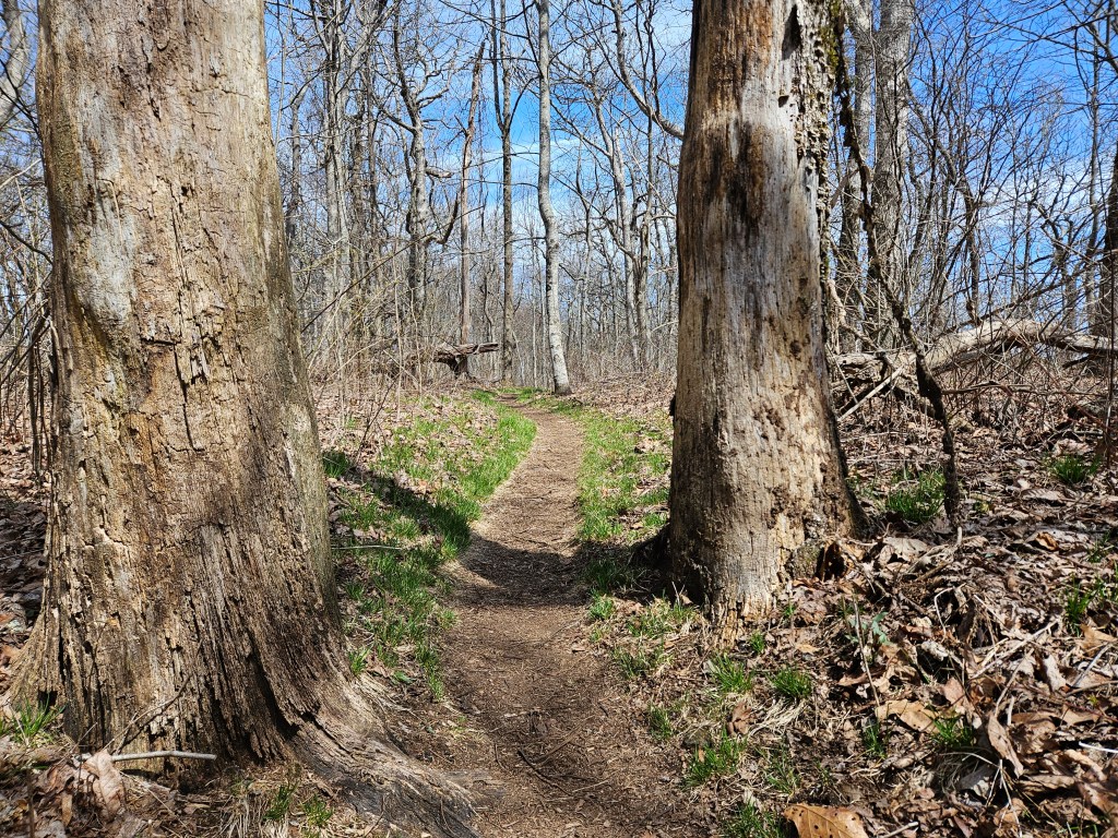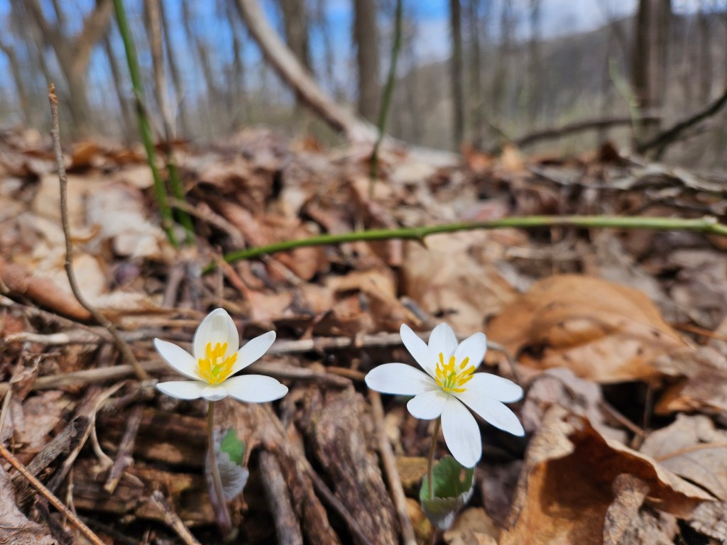 In late March, the woods are still in winter mode with very few leaves on the trees. The best part of this time of year is that the blood roots are starting to bloom.